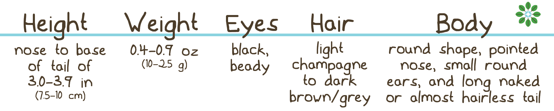 These creatures may be small, but they are mighty! Their body length from the nose to the base of their tail ranges from 2-3 inches and they weigh less than an ounce. Their tails can be almost as long as their entire body. They have a round shape, black beady eyes, a pointed nose, and small round ears. Their short hair can be anywhere from dark to light brown, grey, or black, but their paws, ears, and long tail are almost hairless. A deer mouse has white feet and large ears, which are a couple of ways to tell the difference.
